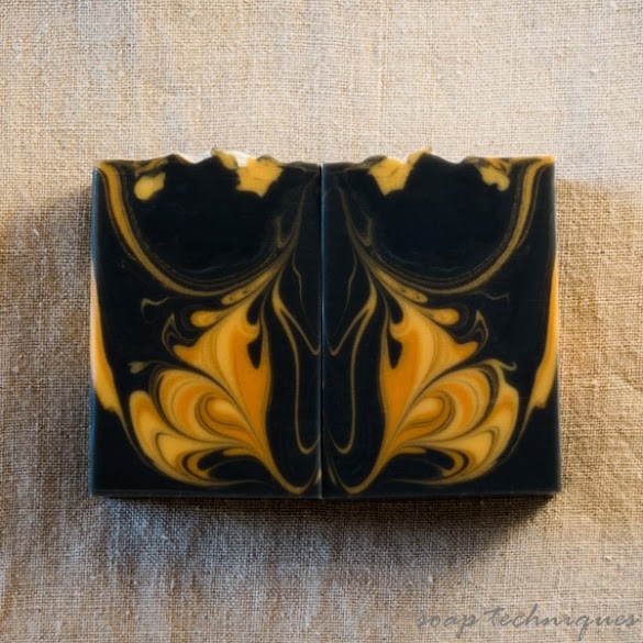 Below are two of my soaps, both made with the hanger swirl technique. The first one is colored with activated charcoal and 2 golden micas. I'm pretty pleased how it turned out: